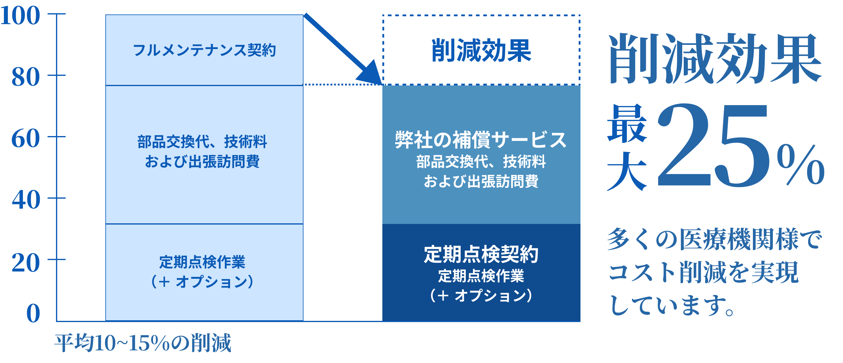 設置年数や修理実績、メーカーの保守契約の内容等により総合的に診断いたしますので、削減が出ないという診断結果になるケースもございます。